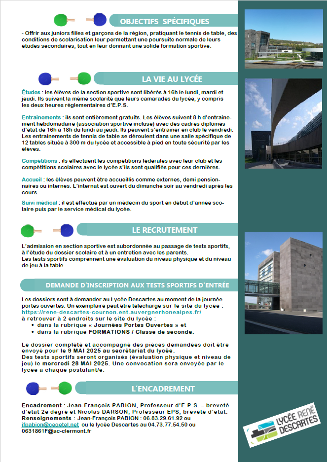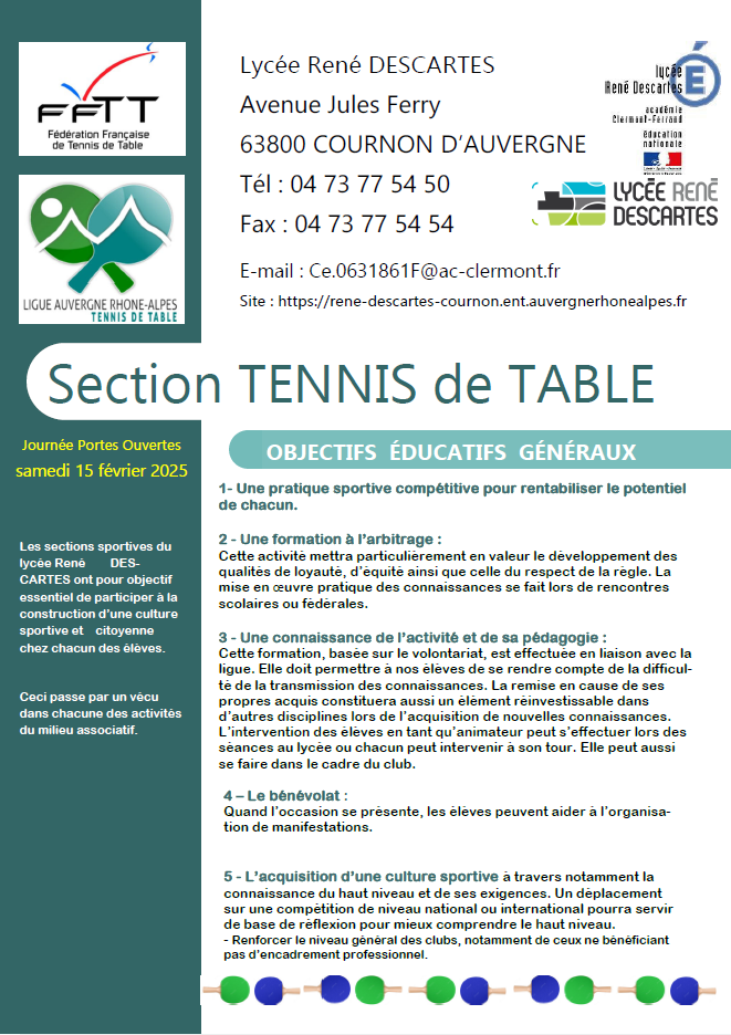 Accueil » Lycée Descartes (63) section tennis de table Actualités Générales Lycée Descartes (63) section tennis de table Retrouvez la plaquette-Tennis-table-2024-6 Partager ceci Article précédentParticipation de la Ligue AURA aux Internationaux Jeunes du Grand Est Article suivantCQP Animateur TT Normandie 11 décembre 2024